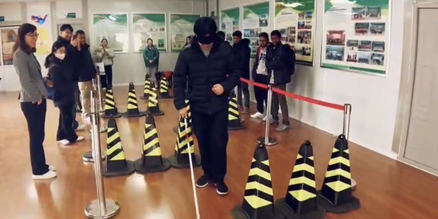 在对导盲犬基地有了初步了解后,职工们跟随老师来到导盲犬模拟训练场,观看了训练师与导盲犬之间的默契配合。在互动环节里,同学们获得了一次特殊的体验——戴上眼罩,手持盲杖,模拟盲人走路。一开始,职工们步伐谨慎而缓慢,在黑暗中摸索前行,深刻体会到了盲人出行的不便与艰难。