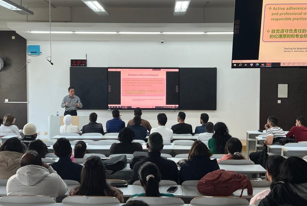 讲座中,雷海新教授以《科研中的道德伦理建设》为主题进行全程英文讲解。他从科研工作者的个人诚信、实验记录、数据处理的伦理原则、学术不端四个方面,深入浅出地讲解了科研中伦理审查的重要性。认真讲解了学术规范的基本要求,着重强调论文撰写格式规范的重要性;以论文撰写各环节的常见问题为例,探析如何提升创作投稿效能。讲座结束后,参会职工就科研过程中的常见问题与雷海新教授进行了深入交流。